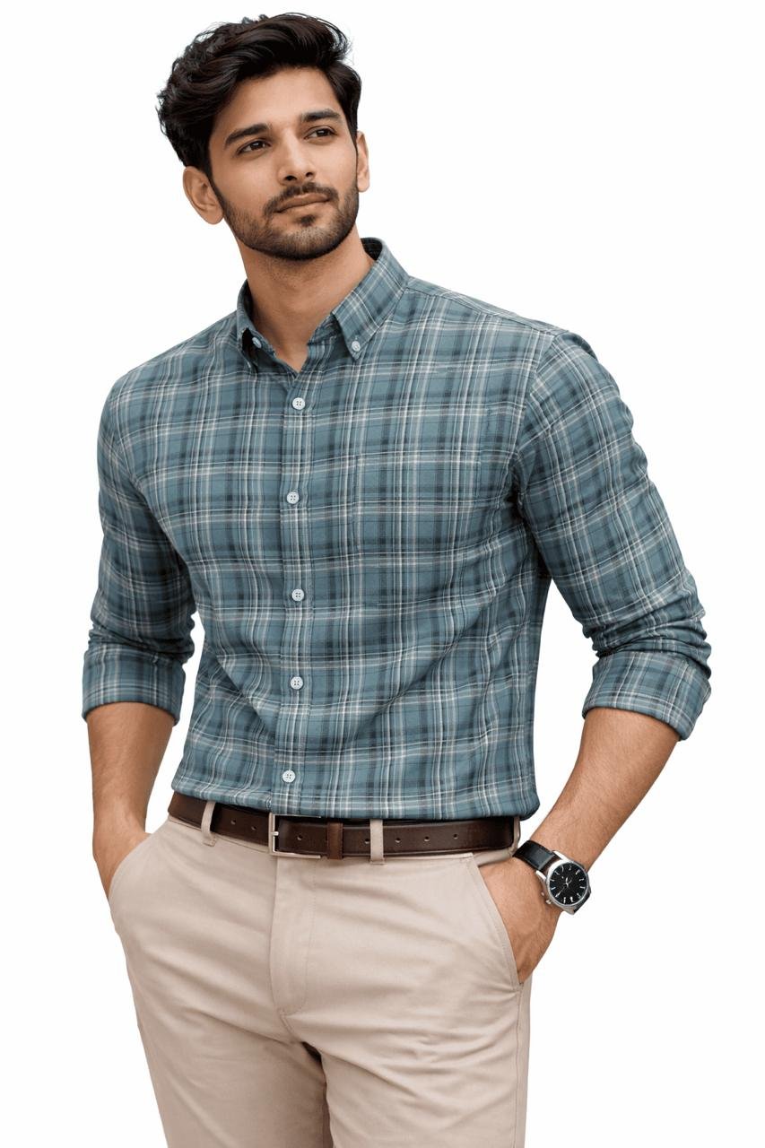 This green classic check shirt is a clean and sharp choice for both office and semi-formal outings. The checked pattern gives it a fresh, stylish look without being too loud. It comes with full sleeves, a neat collar and a comfortable fit that works well throughout the day. Paired with grey trousers, it creates a balanced, polished look that feels modern and easy to carry. The fabric is soft and breathable, making it a practical option for anyone who wants to stay comfortable while looking well-dressed.