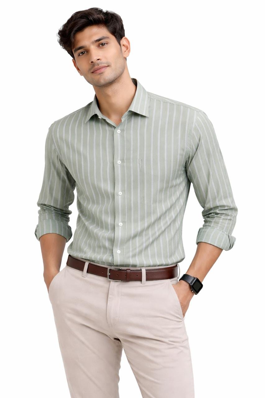A smart sage-green shirt featuring crisp vertical white stripes for a clean and refined look. Made for all-day comfort with a tailored fit that pairs perfectly with both formal trousers and chinos.